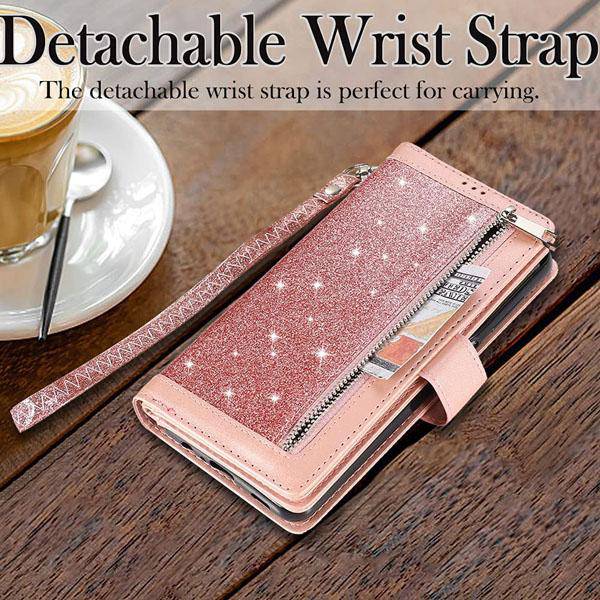 ▶[LARGE CAPABILITY+WRIST STRIP]:Inside features 9 card slots,1 zipper coin pocket, 2 side pockets conveniently store your ID, license,photo,cash and credit cards.Detachable LEATHER HAND STRAP to allow for easy fastening and access to your Phone without hassle.