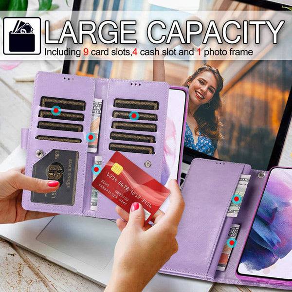 [LARGE CAPABILITY+WRIST STRIP]:Inside features 9 card slots,1 zipper coin pocket, 2 side pockets conveniently store your ID, license,photo,cash and credit cards.Detachable LEATHER HAND STRAP to allow for easy fastening and access to your Phone without hassle.