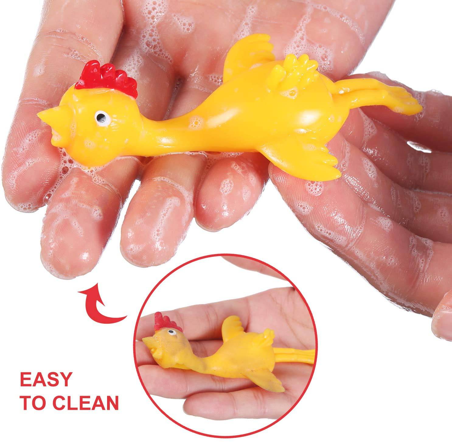 • It's a very interesting process seeing slingshot chickens flying in the office, kitchen or outdoor yard .They stick on wall ,ceiling even your friend's back then fall off slowly. Perfect outdoor games and party favor for kids and teens.