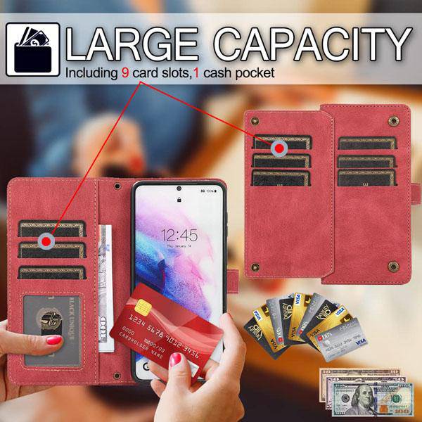- Large Capacity Crossbody Wallet Case--Included 9 card slots and 1 money pocket to carry your cards including credit cards, ID Cards, driver's license, and so on. Of course, you can also put some money in the cash pocket. Don't worry your cards or money will slide from the crossbody phone case, because the thie case will ensure the complete enclosure of the wallet part.
