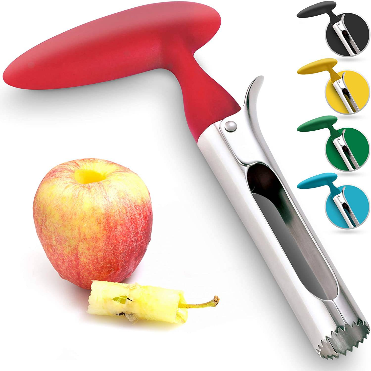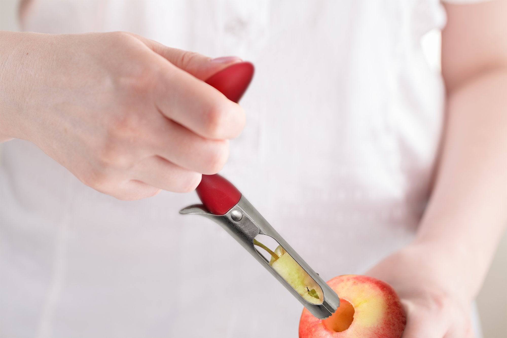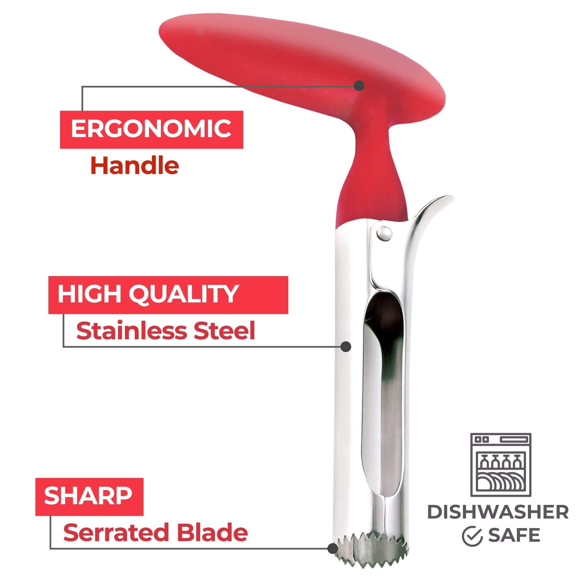 • SMOOTH ERGONOMIC HANDLE The beautiful apple-red handle is molded to give you a super comfortable and steady grip. The non-slip design makes coring easy and fun. It can be comfortably held and used by seniors and those with arthritic hands.