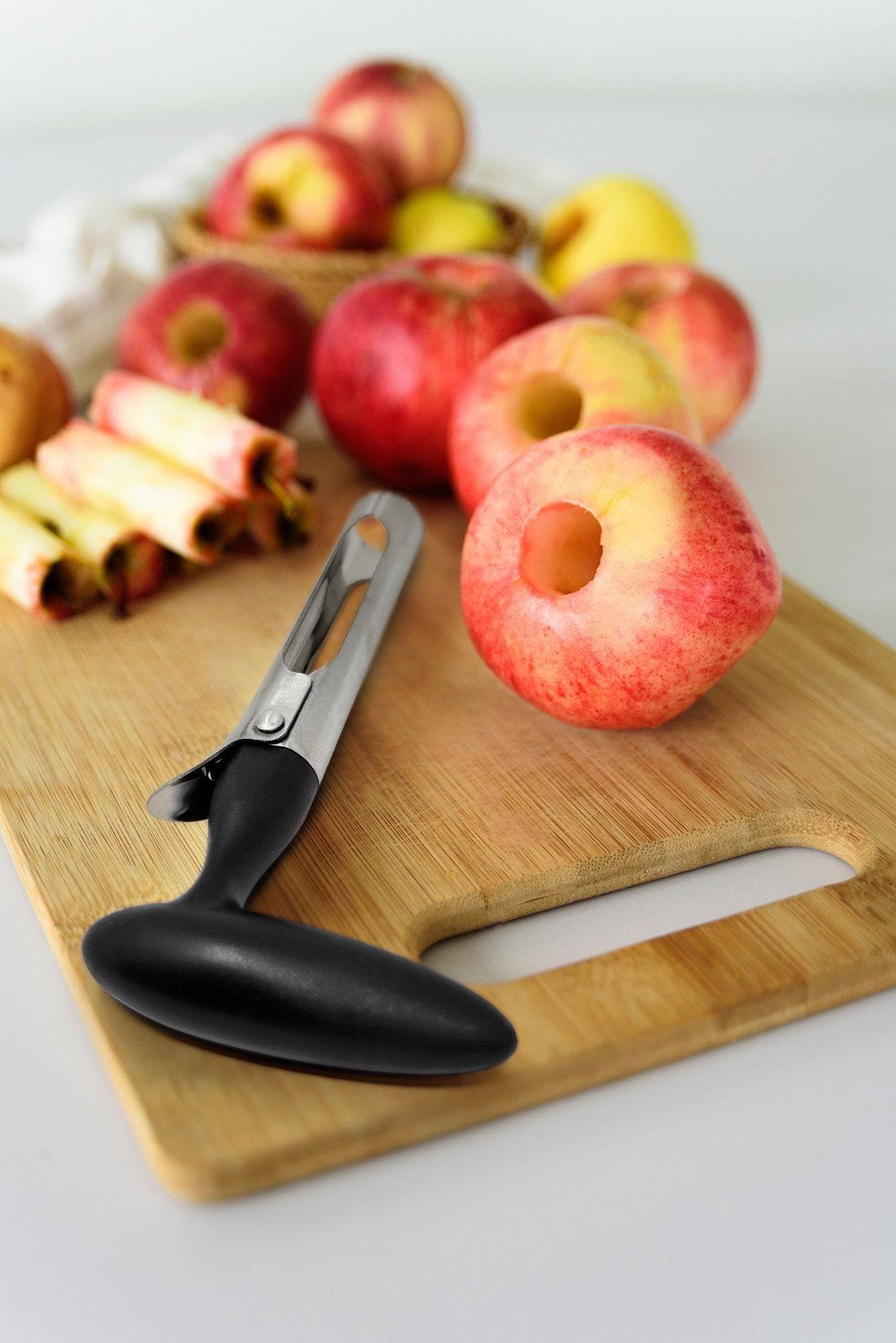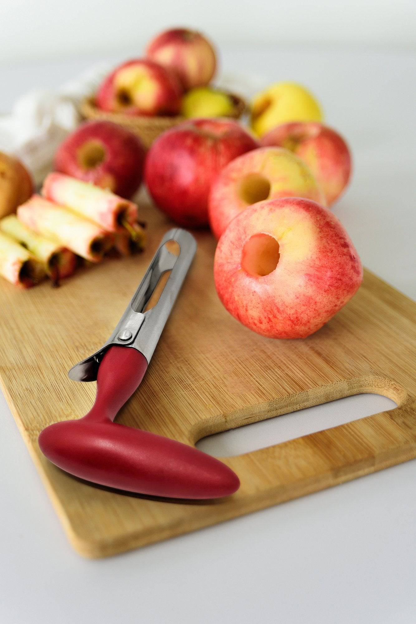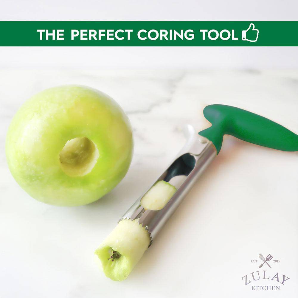 Whether you are cooking, baking, blending, peeling or juicing, use this amazing coreer tool on apples, pears, pineapples, tomatoes, cucumber, onions, bell peppers, zucchini, fuji, honeycrisp, gala, red delicious, pink lady apples and more, to remove unwanted cores and seeds. Unlike a knife, applepeeler, cutter, peeler machine or dicer, this tool is effective in preserving the parts of the fruit you most enjoy. Simply punch and twist to get every seed. Simple peel, core and slice any apple for apple pie.
