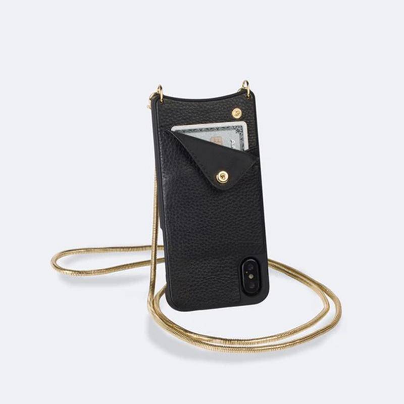 The Crossbody features a classic black leather case and gold-tone details, this is a favorite among stylists and one of the original crossbody cases. Its simple snake chain shoulder strap and hidden snapback credit card compartment make it a must-have for any on-the-go activity or high fashion lifestyle.
