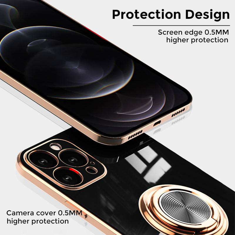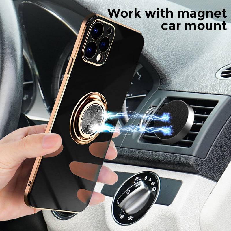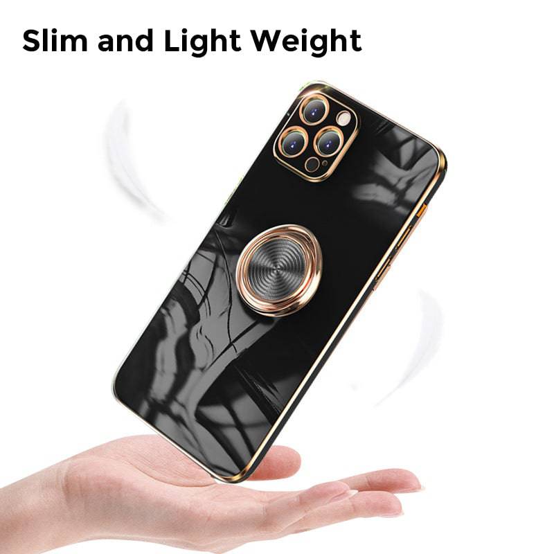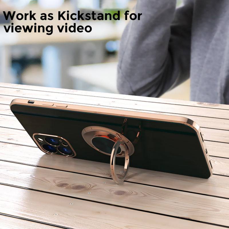 Shiny plating rose gold edge with ring holder design for hands-free viewing, it's convenient for you to watch videos and movies with enviable comfort. The center of the finger holder ring there is a piece of hidden iron, it is easy to connect and remove the phone from the magnetic car mount.