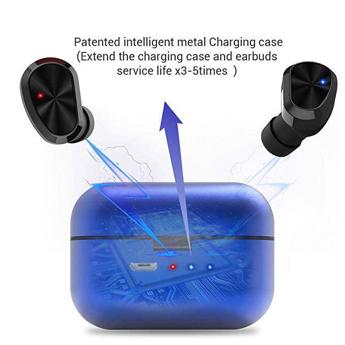 [High-end metal charging compartment with patented independent power management technology] Aluminium alloy charging compartment, This exclusive patented independent power management technology enables The charging compartment can separately control the charging of the left and right earphones separately, place the L&R earphone into the Charging Station, One Red LED indicates the earphone No power, One blue LED indicates the ear-bud charged fully, The ear-buds will charge automatically .